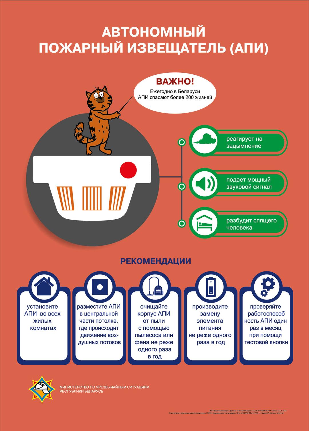 Сам прибор не требует специальных навыков и дополнительных расходов при эксплуатации. Рекомендуется раз в год очищать пожарный извещатель от пыли при помощи пылесоса и каждый месяц проверять его работоспособность, нажимая на тестовую кнопку. Он должен пищать около 5-10 секунд. Мигающий сигнал светодиода красного цвета, расположенный на корпусе извещателя, также свидетельствует о его исправности и нахождении в дежурном режиме работы. Работает от батарейки типа «Крона». Приобрести АПИ можно в торговой сети, а также филиале РГОО «БДПО» по адресу г. Петриков, ул. Бумажкова, 66.