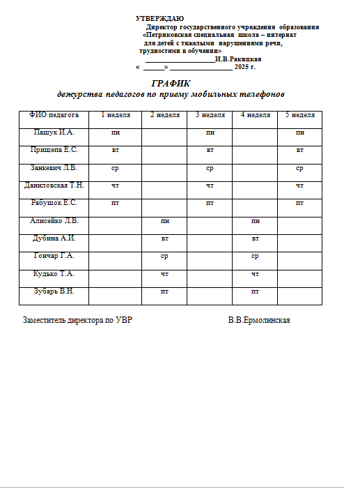 График дежурства педагогов по приему мобильных телефонов