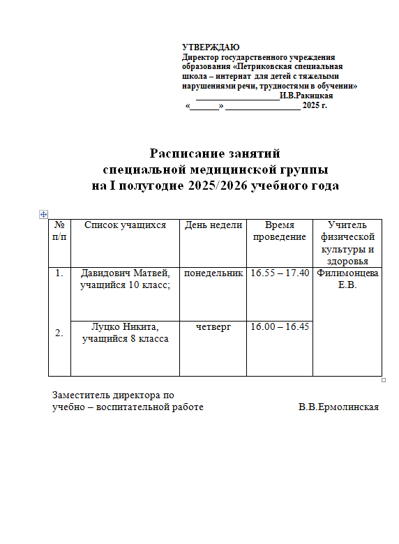 Расписание занятий специальной медицинской группы